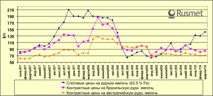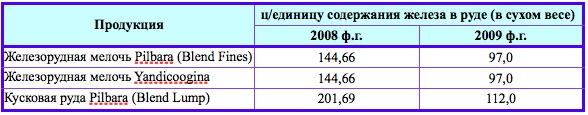 Особенностью прошедшего года стали длительные переговоры по уровню контрактных цен на ЖРС в 2009 ф.г. Сокращение производства черных металлов и потребления ЖРС в мире привели к снижению уровня цен по долгосрочным контрактам на 2009 ф.г. по сравнению с предыдущим ф.г. Но снижение уровня цен стало слишком незначительным по сравнению с падением уровня цен на черные металлы на мировом рынке и снижением уровня производства и потребления чугуна и стали. В середине третьей декады мая было достигнуто первое соглашение по уровню цен на ЖРС с поставкой в 2009 финансовом году (с апреля 2009 г.). Австралийская Rio Tinto достигла соглашения с японской Nippon Steel Corp о снижении уровня цен на железорудное сырье. Цены на железорудную мелочь были снижены на 33 % по сравнению с предыдущим финансовым годом, а на кусковую руду – на 44 %.