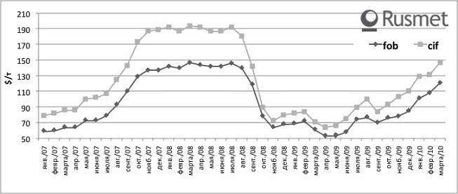 Китай, являющийся крупнейшим импортером и потребителем железной руды, и в августе продолжал настаивать на снижении уровня цен на ЖРС. Австралийская Fortescue Metals roup (FMG) 17 августа сообщила о том, что достигла соглашения по уровню цен на свою железорудную продукцию с Baosteel Group Corporation и CISA при поставках на китайские предприятия в период с 1 июля по 31 декабря 2009 г. Цена на железорудную мелочь (Rocket Fines) установлена на уровне $0,94 за единицу содержания железа в руде на условиях FOB. Это примерно на 3 % ниже уровня цен, которые были установлены между группой Rio Tinto с металлургическим и компаниями стран Восточной Азии (без Китая) и примерно на 35% ниже цен предыдущего года.Baosteel Group и CISA достигли также соглашения об установлении цены на высококачественную кусковую руду на уровне $1,00 за единицу содержания железа в руде на условиях FOB, что также ниже уровня цен по годовым контрактам ($1,12/dmtu, FOB). В настоящее время уровень цен на ЖРС на спотовом рынке превышает уровень контрактных цен. Спрос на железорудном рынке со стороны китайских металлургов остается стабильно высоким. По словам участников рынка, ввиду высоких цен на импортный материал отдельные металлургические компании могут ограничить закупки зарубежного сырья и переориентироваться на внутренний рынок. Растущие цены на рынках других сырьевых материалов, в особенности угля и кокса, являются дополнительным фактором роста цен. Также активным остается спрос на конечную продукцию, что приводит к росту объемов производства и, соответственно, потреблению сырья. Во второй половине марта на железорудный экспортный рынок вновь вышла Австралия, которая в IV кв. прошлого года практически ушла с рынка, стремясь создать искусственный дефицит. Уход с рынка связан со стремлением крупнейших поставщиков ЖРС повлиять на рост цен по годовым контрактам. Основная причина выхода Австралии на рынок – активный спрос на ЖРС со стороны Китая, а также окончание переговоров поставщиков с основными потребителями по уровню контрактных цен на 2010 ф.г. Следует отметить, что рост спотовых цен на железорудное сырье, поставляемое из Индии в Китай, также связан с тем, что индийское правительство повысило экспортные пошлины кусковую руду и рудную мелочь на 5 %. Однако, это не привело к существенному снижению экспорта ЖРС из Индии, так как активным остается спрос со стороны зарубежных покупателей. Бразильская Vale, крупнейший производитель ЖРС в стране, достигла договоренности по уровню контрактных цен с отдельными японскими потребителями. Так, цена на II квартал (апрель-июнь) составила $100-110/т fob, что на 90 % превысило прошлогодний уровень.Vale объявила о реализации новой ценовой политики для долгосрочных контрактов по поставкам ЖРС. Компания рассматривает возможность установления стоимости поставляемого сырья на условиях c&f и fob в зависимости от месторасположения потребителя. Зачастую, бразильского поставщика не удовлетворят стоимость сырья на условиях fob при поставках в дальневосточные порты, так как у австралийских поставщиков стоимость получается традиционно выше. Таким образом, компания планирует частично переложить стоимость фрахта на потребителя. Также крупнейшие поставщики рассматривают возможность перехода на квартальные контракты, в которых цены будут пересчитываться с учетом среднерыночных цен на спотовом рынке. Ини