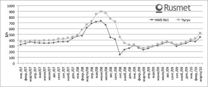 В 2009 г. ситуация на рынке стального лома кардинально изменилась. Во-первых, резкое увеличение производства стали в Китае привело к расширению спроса на металлолом с его стороны, а, во-вторых, китайские трейдеры в значительной мере исчерпали запасы легкодоступного вторсырья, из-за чего сборы перестали расти. В 2009 г. Китай стал крупнейшим импортером стального лома в мире, опередив Турцию. При этом повышенный спрос на лом со стороны Китая сопровождался резким снижением объемов потребления лома в США, Японии и странах Европы, что позволило этим странам расширить экспортные поставки данного вида продукции. Ожидается, что в 2010 г. Китай не снизит закупки стального лома на мировом рынке, в то же время восстановление металлургической промышленности Западных стран после финансово-экономического кризиса приведет к увеличению потребности в металлоломе в США, Японии и странах Европы. Однако предпосылок для увеличения сбора стального лома не наблюдается: многие инвестиционные проекты были отменены, отложены закупки дорогостоящего оборудования, снизились объемы производства на металлоперерабатывающих предприятиях и т.д. Все это приведет к дефициту стального лома в 2010 г. и росту цен. В настоящее время на рынке лома наблюдается высокая деловая активность, цены растут. Росту цен способствовали, во-первых, ограниченное предложение материала, во-вторых, подорожание кокса, чугуна, ЖРС и угля. В марте по сравнению с уровнем февраля рост цен на лом составил $80-90/т. Дисбаланс спроса и предложения на рынке лома произошел из-за сезонного фактора. Повысился спрос на лом в экспортоориентированных странах, что привело к снижению экспортных поставок. Однако рост цен на лом позволил вновь переориентировать часть объемов с внутреннего на внешние рынки.