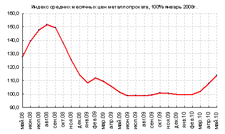 По данным SteelWeek на 28.05.2010 за месяц общий индекс мировых цен на стальную продукцию вырос на 4,5%. Плоский прокат подорожал на 5,7%, а длинномерный подорожал на 2,4%. На европейском рынке цены выросли на 15,9%. На азиатском рынке цены выросли на 0,6%. Цены на рынках Северной Америки увеличились на 1,9%.