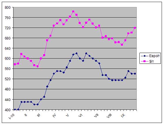 Курс евро, в начале сентября составлявший $1,26-1,28, к концу месяца превысил $1,34. Это привело к увеличению разрыва между стоимостью импортной и местной продукции. Украинские экспортеры предлагают горячекатаные рулоны в страны Восточной и Юго-Восточной Европы по $620-640 (461-476) евро за т CFR/DAF, а поставщики из других стран – максимум, по 500-525 евро за т CFR. Импортная толстолистовая сталь, в первой половине сентября доходящая до 550 евро за т CFR, теперь подешевела до 520-530 евро за т CFR. Некоторые итальянские компании, ранее продававшие толстый лист по 580-600 евро за т EXW, сбавили октябрьские котировки до 560-570 евро за т EXW.