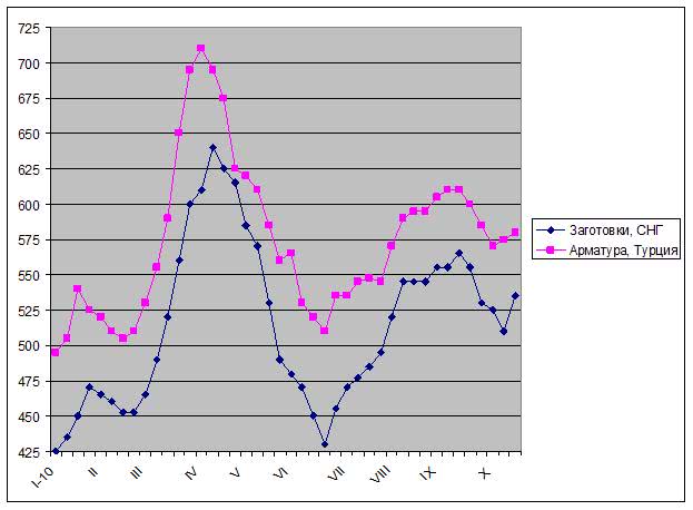 Правда, поставщики из СНГ могут столкнуться с конкуренцией со стороны Турции. Для многих компаний из этой страны экспорт заготовок становится единственной приемлемой альтернативой длинномерному прокату, спрос на который в странах Ближнего Востока падает (имеется в виду импортная продукция). В середине октября турецкие металлурги предлагали заготовки по $530-540 за т FOB, а на внутреннем рынке котировки, как правило, находились в интервале $520-530 за т EXW (без НДС).