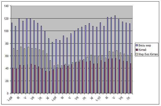 Впрочем, пока что отрасль идет с опережением прошлогоднего графика. За первые три квартала текущего года в мире было выплавлено 1046,3 млн. т стали, на 20,9% больше, чем за тот же период годичной давности. При этом, правда, большая часть прироста пришлась на первое полугодие. В сентябре 2010 года результат того же месяца 2009-го был превышен только на 2,7%. По сравнению с январем-сентябрем 2008 года выплавка возросла на 1,3%, однако, если рассматривать по отдельности Китай и страны остального мира картина получится противоположная. Производство стали в Китае за девять месяцев 2010 года было на 22,0% больше, чем два года назад, а в прочих странах в совокупности – на 11,2% меньше.