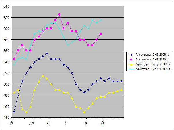 Свою роль в прекращении спада сыграл и сырьевой фактор. Уже в конце октября стартовало сезонное повышение цен на металлолом. Судя по всему, ресурсы этого материала в ближайшие месяцы будут ограничены, так что многие экспортеры придерживают лом и заранее поднимают котировки. Активизация китайских металлургов и трейдеров на спотовом рынке железной руды способствовала подъему цен и на этот ресурс. С середины сентября по конец ноября котировки на ЖРС прибавили более 15%, достигнув самого высокого значения за полгода. Очевидно, теперь следует ждать повышения цен на первый квартал 2011 года.