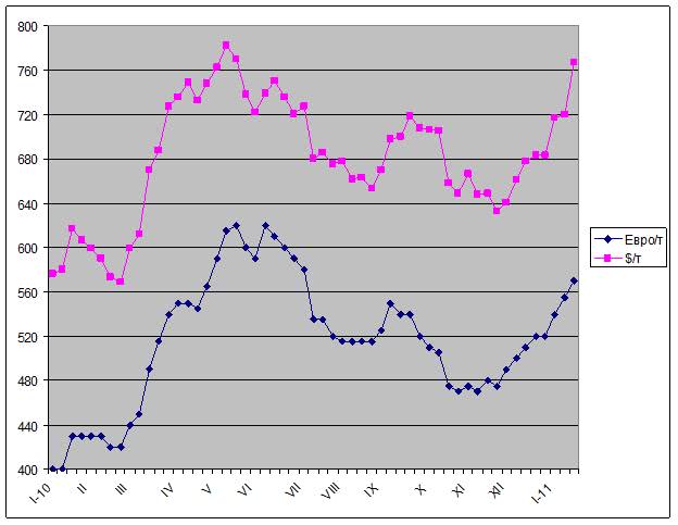 Наконец, курс евро, оттолкнувшись в начале января от дна, снова пошел вверх, превысив отметку $1,34 за 1 евро. Это означает, что европейские компании теперь предлагают горячекатаные рулоны, как минимум, по $750 (560 евро) за т EXW, тогда как российская, украинская и китайская продукция, как правило, не превышает $740-750 евро за т CFR/DAF.