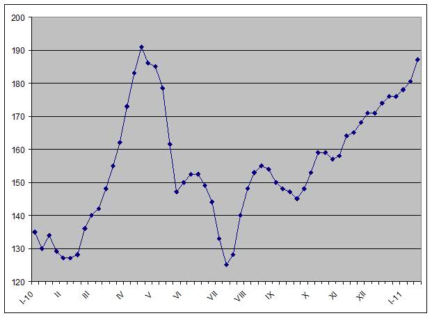 Прежде всего, резко против ежемесячных контрактов выступают сами металлурги. И сейчас им довольно сложно планировать затраты на ближайший квартал, поскольку они получают цену на руду, в лучшем случае, за месяц до его начала. Если контрактные котировки будут меняться каждый месяц, то о какой-либо стабильности расходов для металлургов вообще не может быть и речи. Так, в прошлом году цены на 63,5%-ный индийский концентрат колебались от $125 до более $190 за т CIF Китай. Сейчас из-за дефицита сырья, возникшего вследствие наводнений в Бразилии и ограничений на экспорт в Индии, они снова почти достигли $190 за т CIF Китай и, по мнению некоторых аналитиков, могут подняться и до $200 за т. При этом, в декабре прошлого года средняя стоимость руды составляла около $174 за т CIF Китай.