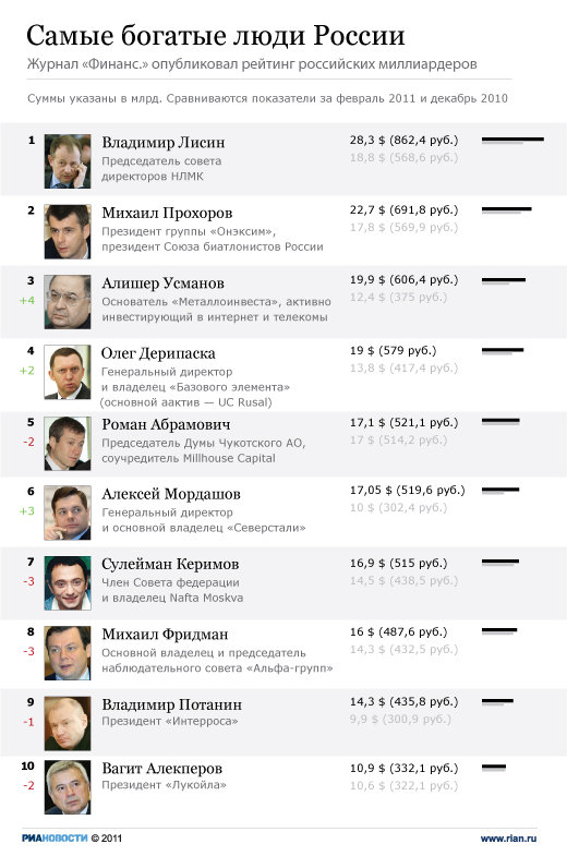/Rusmet.ru, Геласимов Виктор/ Журнал "Финанс" опубликовал свой рейтинг российских миллиардеров, исходя из которого можно сделать вывод, что металлурги - самые богатые люди России, и что металлургия у нас процветает. По крайней мере, больше, чем нефтяная промышленность. Позволим не согласиться. Понятно, что любой рейтинг имеет свою субъективность, однако, сегодня он может больше отражать прозрачность бизнеса компаний, а не реальное положение дел. При тех долгах, которые лежат тяжким бременем на комбинатах и металлоторговых компаниях, трудно говорить о богатстве. Смеем также предположить, что большинство из участников рейтинга не в восторге от попадания в список в сегодняшних условиях. Как говорят: "Кто не спрятался - я не виноват!"
