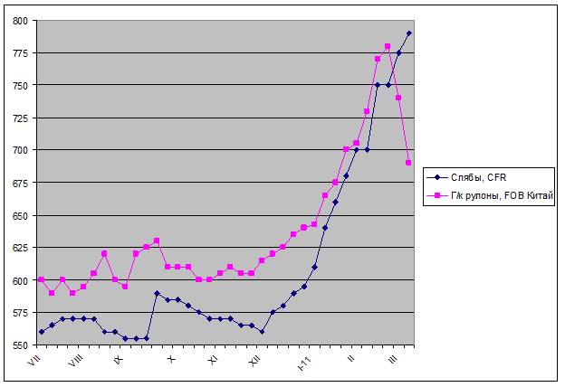 В начале марта тайванская компания China Steel объявила о повышении экспортных котировок на плоский прокат на апрель-май на $80-170 за т. Цены на горячий прокат должны были выйти на уровень $800-820 за т FOB. Японские металлурги настроены более агрессивно. Компания Tokyo Steel Manufacturing заключила мартовские соглашения с покупателями в Юго-Восточной Азии и Латинской Америке из расчета около $830 за т FOB, а корейским производителям холодного проката, в первом квартале покупавшим японские горячекатаные рулоны по $700 за т FOB, предлагается повышение до $900 за т FOB в апреле, $950 за т в мае и $1000 за т в июне. Ранее японские компании потребовали роста цен на $240-300 за т при внутренних поставках листовой стали национальным промышленным корпорациям. Впрочем, корейцы заявляют, что сами будут продавать холодный прокат в апреле только по $950 за т FOB, так что для них предельным уровнем цен на подкат будет не более $850 за т CFR. Да и, в конце концов, на рынке есть китайские горячекатаные рулоны стоимостью менее $750 за т CFR.