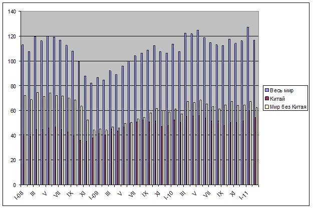 Однако наибольший интерес вызывают даже не февральские показатели, а значительные коррективы, которые WSA внесла в январские данные. Производство стали в Китае, которое в предыдущем отчете указывалось на уровне 52,8 млн. т, в действительности оказалось в январе равным 59,9 млн. т – абсолютный рекорд в истории отрасли. Соответственно, и мировой объем выплавки стали в январе 2011 года достиг максимального значения – 127,0 млн. т. В странах «остального мира» выпуск составил 67,1 млн. т – достаточно высокий показатель, но не самый большой за последние 12 месяцев.