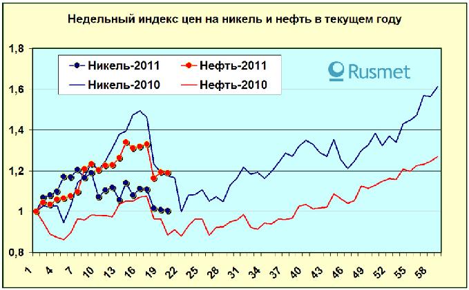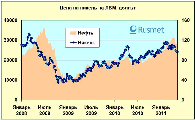 Стоит также отметить еще одну тенденцию, явно проявляющуюся на графике цены: в 2011 году коррекция на рынке никеля (по сравнению с рынком нефти) началась несколько раньше. Аналогичное явление наблюдалось и в 2008 году.