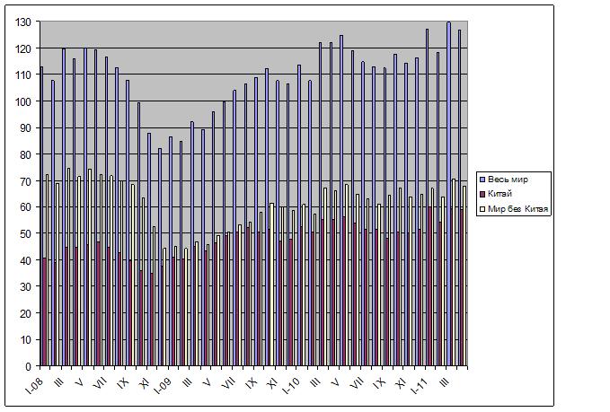 Несмотря на неблагоприятные условия, сложившиеся в апреле на мировом рынке стали, металлурги не принимали особых мер по сокращению избытка предложения. В целом более низкие апрельские показатели по сравнению с мартовскими объяснялись, прежде всего, меньшим количеством рабочих дней в апреле по сравнению с мартом. Как сообщает WSA, уровень загрузки производственных мощностей в глобальной отрасли даже увеличился в апреле до 82,8% против мартовских 81,9%. Даже в пострадавшей от катастрофического землетрясения Японии спад в апреле составил менее 700 тыс. т по сравнению с мартом или около 7,6%.