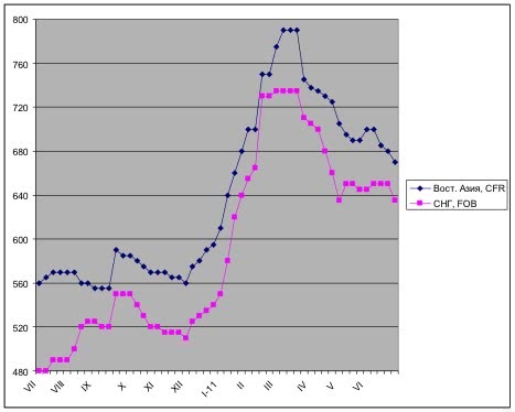 Требования покупателей, в принципе, вполне понятны. Ожидавшегося этой весной повышения цен на плоский прокат в Восточной Азии не произошло. Наоборот, котировки падают из-за недостаточного спроса. Стоимость японского, корейского и тайванского горячего проката при поставках на внешние рынки к концу июня сократилась до около $700-720 за т FOB. Внутренние цены на коммерческие горячекатаные рулоны на Тайване составляют около $735-775 за т EXW и только у China Steel превышают $800 за т. В Корее продажи данной продукции (произведенной не Posco) реально осуществляются по ценам ниже $820 за т EXW.