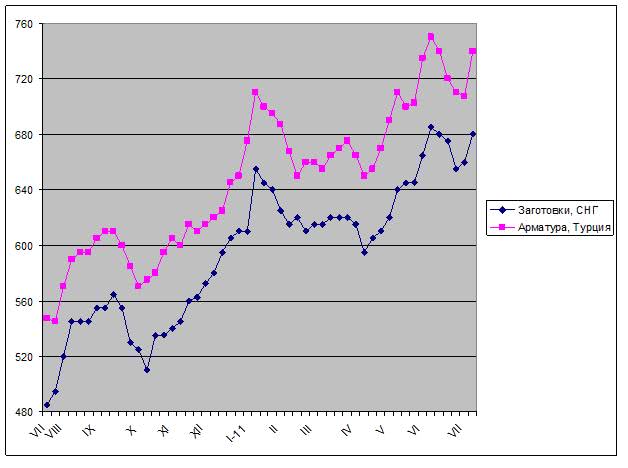 Наконец, очень важное, можно сказать, решающее влияние на заготовки оказывает рынок Турции, где, во-первых строительная отрасль на подъеме, а, во-вторых со дня на день ожидается резкое подорожание металлолома. Поставщики же полуфабрикатов из СНГ ориентируются, прежде всего, на экспортные котировки на турецкую арматуру, которые в настоящее время достигли $735-745 за т FOB невзирая на ограниченный спрос.
