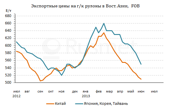 Судя по всему, дальневосточный рынок плоского проката еще достаточно далек от желанной стабилизации. Спрос на стальную продукцию в регионе уменьшается вследствие начавшегося сезона дождей и восстановится только ближе к осени. При этом, металлурги пока не сбавляют оборотов, так что избыток предложения сохранится. Наконец, сильное понижающее воздействие на прокат оказывает внезапно подешевевшая железная руда. Экспортеры сырья долгое время успокаивали себя тем, что при высоком спросе на руду со стороны Китая цены на нее не упадут в обозримом будущем до менее $120 за т CFR, а они таки упали, приблизившись теперь к отметке $110 за т CFR. Не исключено, что в ближайшем будущем железная руда и горячекатаные рулоны будут тянуть друг друга все глубже и глубже на дно.