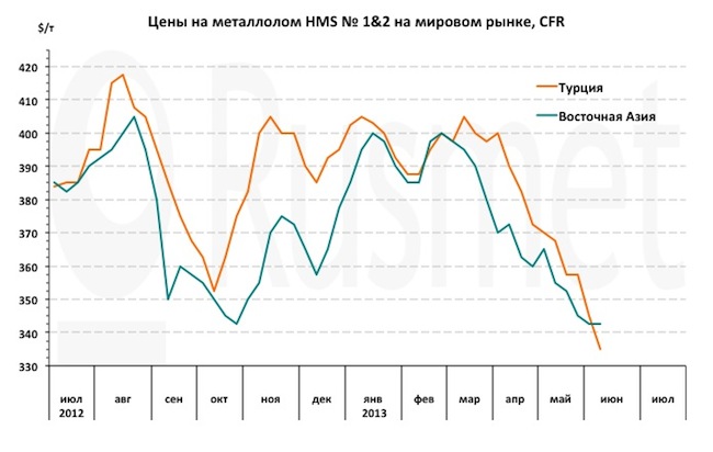 Основнойпричиной падения специалисты называют структурные изменения на мировом рынкелома, происшедшие в последние месяцы. Прежде всего, речь идет о резком (болеечем на 18% по итогам первых четырех месяцев текущего года) сокращении закупоксырья его крупнейшим импортером – Турцией. Металлургические компании из этойстраны были вынуждены сократить объемы выплавки стали вследствие падения спросаи цен на длинномерный прокат на Ближнем Востоке. Кроме того, ряд мини-заводов вэтом году переориентировались на приобретение вместо металлолома полуфабрикатовместного производства либо импортированных из СНГ.
