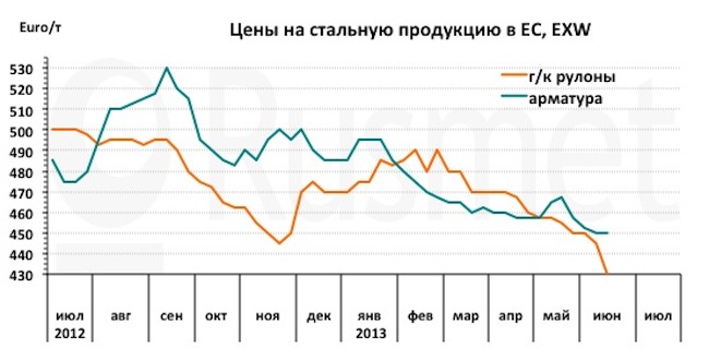 Из-за слабого спроса и конкуренции со стороны Ilva другие производители плоского проката в Европе были вынуждены понизить котировки на 15-40 евро за т по сравнению с серединой мая. В частности, центральноевропейские предприятия сбавили цены на горячекатаные рулоны до 410-430 евро за т EXW. В Германии и странах Бенилюкса эта продукция может превышать 450 евро за т EXW, но такие цены часто являются номинальными. Большинство покупателей считают, что плоский прокат еще будет дешеветь. Не исключено, что для горячекатаных рулонов крайняя точка спада составит менее 400 евро за т EXW.