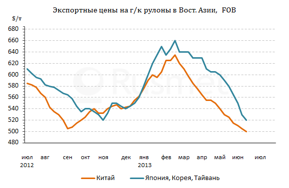 китайского горячего проката, наоборот, понизилась до $490-510 за т FOB, а новые встречные предложения со стороны покупателей в