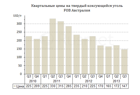 на австралийский «твердый» коксующийся уголь упали до менее $135 за т FOB – уровня начала 2010 года. Американские и канадские