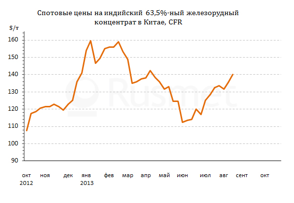 на 63,5%-ный индийский концентрат впервые с апреля достигли отметки $140 за т CFR. Правда, по мнению большинства специалистов, цены
