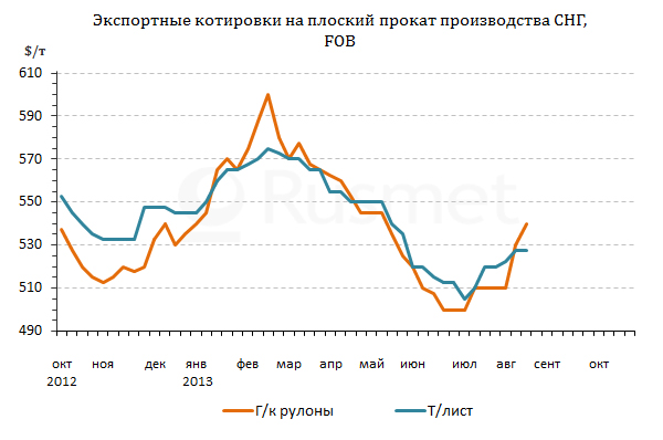 украинского производства, которые в июле находились в интервале $500-520 за т FOB, подорожали до $525-530 за т FOB.