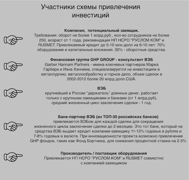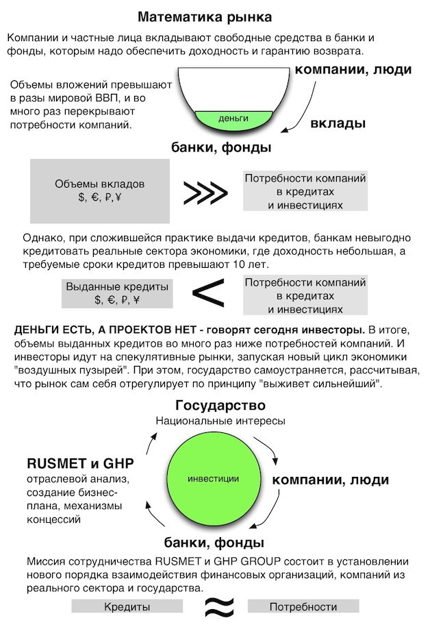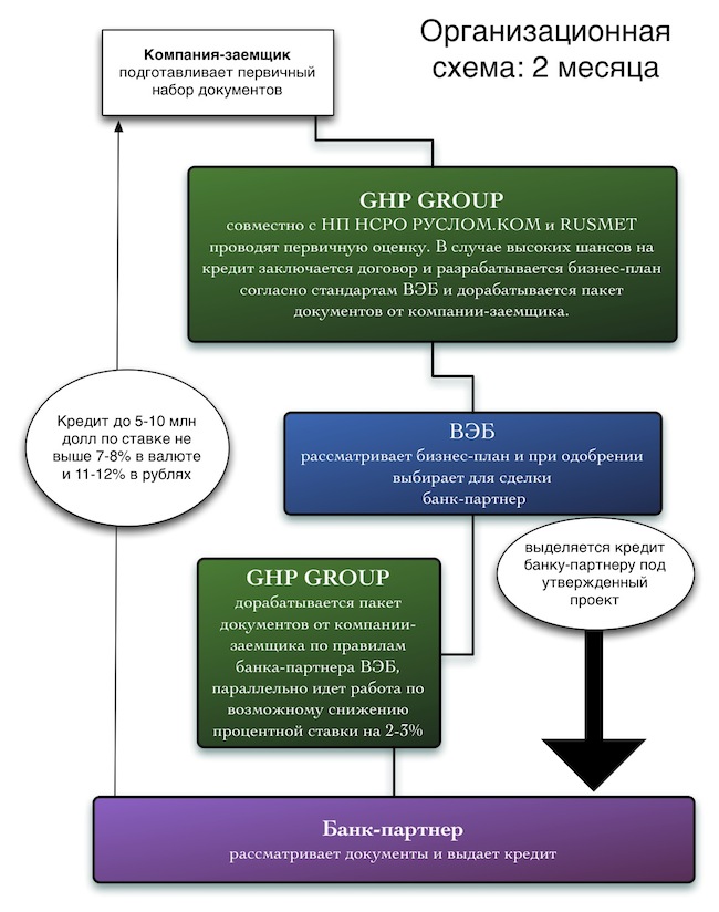 Металлургический портал Rusmet.ru (ООО «Интеллектуальные ресурсы») совместно с НП НСРО «РУСЛОМ.КОМ» (далее – «RUSMET») начинают сотрудничество с финансовой группой GHP GROUP (далее – «GHP») c целью привлечения инвестиций и кредитов в металлургическую отрасль, ломозаготовку, а также в сектора, связанные со сбытом и сервисом потребителей металлопроката. Суммы кредитов – от 10 до 200 млн. руб. RUSMET берет на себя обязательства по отбору компаний-заемщиков, а также функции независимого исследовательского центра для анализа рыночной ситуации в каждом из секторов или сегментов металлургии / металлоторговли и составления прогноза развития рынка, который затем используется GHP для составления индивидуального бизнес-плана для каждого из потенциальных получателей кредита по стандартам банка-кредитодателя. GHP берет на себя обязательства по консультационному сопровождению кредитной сделки: составление всей документации заёмщика согласно требованиям кредитодателя, участие во всех переговорах и встречах между заёмщиком и кредитодателем.