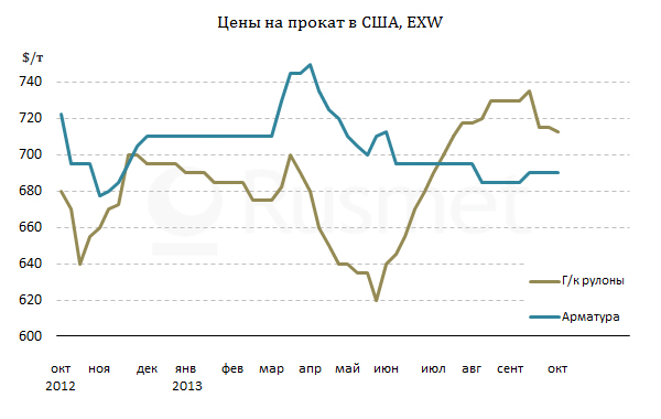 Американские производители длинномерного проката еще в конце сентября были вынуждены отказаться от планов повышения котировок на свою продукцию. Наоборот, стоимость катанки в начале текущего месяца понизилась, в среднем, на $10 за т по сравнению с сентябрем. Низкоуглеродистая продукция строительного назначения продается в настоящее время по $690-720 за метрическую т EXW. Производители арматуры смогли удержать цены на отметке, близкой к $690 за т EXW, но рынок находится под давлением вследствие некоторого удешевления металлолома в октябре.