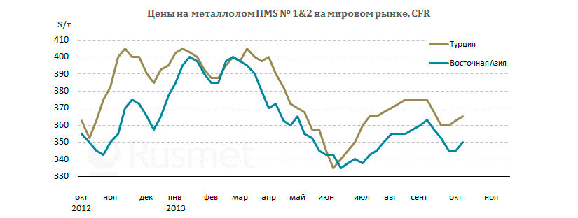 В последние несколько недель спрос на металлолом на мировом рынке имеет ограниченный характер. Турецкие сталелитейные компании в конце сентября – начале октября закупали материал на текущий месяц, однако особого ажиотажа с их стороны не наблюдалось. Тем не менее, американские трейдеры смогли добиться небольшого повышения цен. Котировки на лом HMS № 1&2 (80:20), во второй половине сентября, как правило, не поднимавшиеся выше $365 за т CFR, в октябре смогли закрепиться выше этой отметки. Аналогичный европейский материал в первой декаде сентября продавался немного дешевле $365 за т CFR, причем, экспортеры не шли на уступки несмотря на относительную слабость регионального рынка лома. Высокий курс евро по отношению к доллару способствует устойчивости котировок европейских поставщиков.