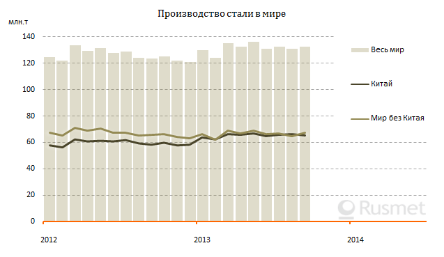 Всего за первые девять месяцев 2013 года мировое производство стали достигло 1186,2 млн. т, на 2,9% больше, чем в тот же период годом ранее. При этом, по-прежнему сохраняется различие в тенденциях для Китая и «остального мира». В январе-сентябре выплавка стали в КНР превысила уровень годичной давности на 8,3%, а за ее пределами сократилась на 2,0%.