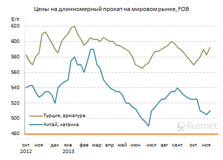 Китайские компании в начале ноября снова понизили цены на длинномерную продукцию. Покупатели в Ливане и ОАЭ получали предложения о поставке арматуры и катанки в январе всего лишь по $535-545 за т CFR. Правда, ближе к середине текущего месяца котировки могут немного возрасти. По крайней мере, китайские экспортеры в последние дни пытаются повысить цены на катанку на $5 за т, до около $505-515 за т FOB.