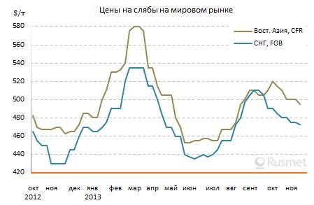 В октябре, когда многие азиатские производители листовой стали надеялись на повышение котировок в ближайшее время, спрос на товарные слябы находился на достаточно высоком уровне, что позволило российским компаниям успешно распродать свою ноябрьскую и, отчасти, декабрьскую продукцию. Правда, металлургам для этого пришлось немного опустить котировки по сравнению с $480-490 за т FOB в начале октября. Новые контракты с индонезийскими и корейскими покупателями были заключены, в основном, на уровне $470-480 за т FOB или $490-500 за т CFR.