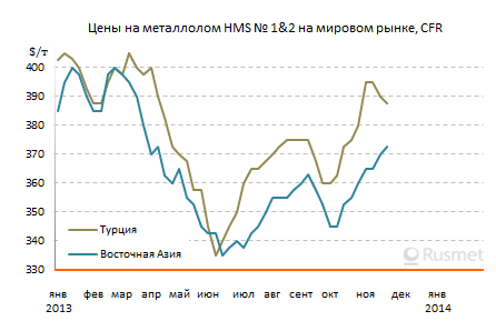 Похожие события происходят и в европейских странах. В ноябре стоимость металлолома в Евросоюзе возросла на 10-20 евро за т благодаря активным закупкам местных металлургических компаний, формирующих зимний запас. В частности, стоимость лома HMS № 1&2 (80:20) или, по европейской классификации, Е3 в Италии достигла $395-400 за т CPT в долларовом эквиваленте, а германские компании приобретали данный материал примерно по $350-370 за т CPT. Хотя в декабре спрос на лом со стороны европейских металлургов должен уменьшиться по сравнению с текущим месяцем, котировки на данное сырье, как ожидается, сохранятся на нынешнем уровне.