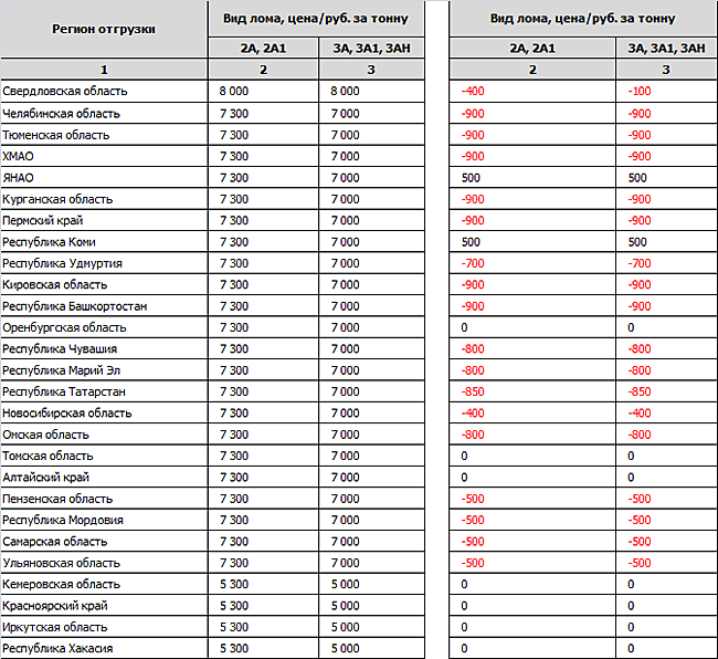 ОАО «ММК» с 09 по 14 декабря заявило о снижении цен практически по всем направлениям. На 16 число текущего месяца больше всего металлолома поступило на комбинат из Челябинской (23,1 тыс. т) и Тюменской (12,3 тыс. т) областей. Средневзвешенная цена с учетом отгрузки из всех регионов составляет 7500 руб./т (без НДС и ж/д доставки).