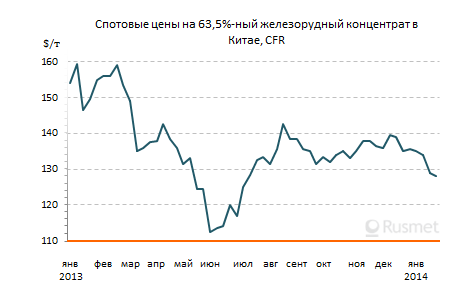 /Rusmet.ru, Виктор Тарнавский/ В конце первой половины января на мировом рынке железной руды начался давно ожидавшийся спад. Котировки на 63,5%-ный концентрат при поставках в Китай впервые с июля прошлого года опустились ниже отметки $130 за т CFR до около $127-129 за т CFR. По сравнению с концом 2013 года руда подешевела более чем на 5%. Для данного рынка, в последние несколько месяцев отличавшегося повышенной стабильностью, это довольно много.