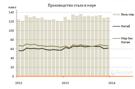 Как ожидается, в 2014 году выплавка стали в Китае должна прибавить не более 3,5-3,7% по сравнению с прошлым годом. Тем не менее, как считают эксперты WSA, глобальный объем выпуска продолжит увеличиваться в текущем году практически прежними темпами. Произойдет это благодаря смягчению контрастов между Китаем и странами «остального мира».