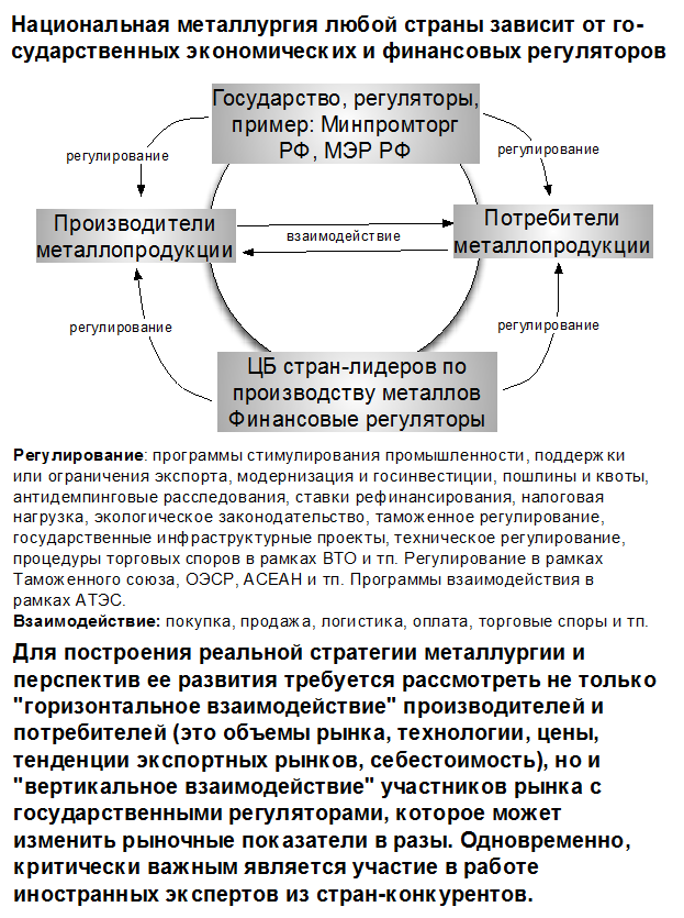 Любое действие лучше бездействия. Очевидно, что государству нужна новая стратегия. Русмет приступил к разработке такой стратегии. Российская металлургия зависит как от ситуации на внутреннем рынке металлопотребления, состояния экспортных рынков, на которых потребляется 30-80% произведенной продукции, а также от развития металлургии в странах-конкурентах. Стратегия -это документ действия, который учтет лучшие мировые практики металлургического бизнеса. Поэтому к работе привлекаются в дополнение к российскому коллективу мировые эксперты. Важно проанализировать меры государственного регулирования и поддержки в странах-конкурентах и странах-потребителях для выработки рекомендаций для России. Важно разработать программы утилизации в транспортном машиностроении для стимулирования спроса на металл российского производства. Необходима государственная программа повышения эффективности предприятий российской металлургии.