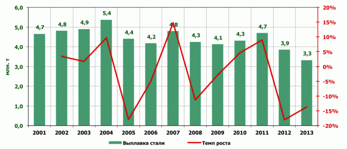 /Rusmet.ru/ В 2013 году выплавка жидкой стали в Республике Казахстан уменьшилась на 15% относительно 2012 года до 3,3 млн. т. Стоит отметить, что отрицательная динамика производства стали в стране наблюдалась уже второй год подряд (Рис. 1).