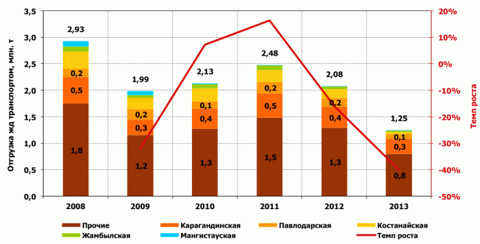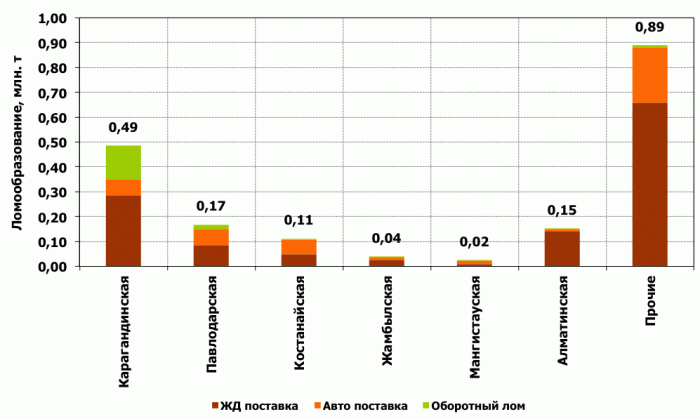 Структура ломообразования по областям, приведенная на Рис. 5 и 6, учитывает отгрузку лома черных металлов железнодорожным транспортом (1,252 млн. т), автомобильным транспортом (0,450 млн. т), а также образование оборотного лома на металлургических предприятиях. По предварительным данным, экспорт лома черных металлов из Казахстана составил в 2013 г. около 0,6 млн. т.