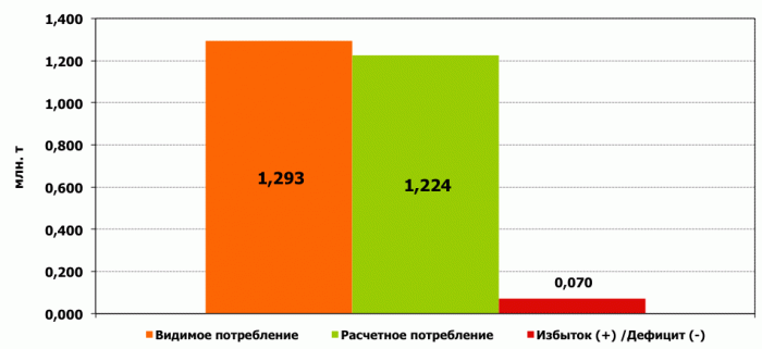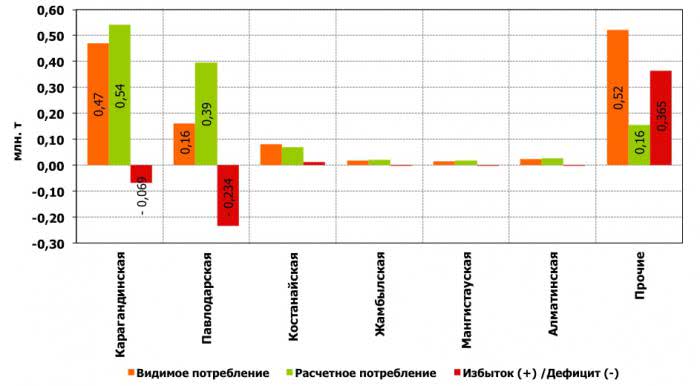 Результаты такого расчета представлены на Рис. 7 и 8, из которых следует, что области, в которых находятся крупнейшие потребители металлолома «АрселорМиттал Темиртау» (Карагандинская обл.) и KSP (Павлодарская обл.) являются дефицитными, однако в целом по Республике предложение лома превышает его расчетное потребление на 0,07 млн. т, что говорит о создании производственного запаса на территории металлургических предприятий (и «зимнего запаса» лома), а также о возможности его экспорта.