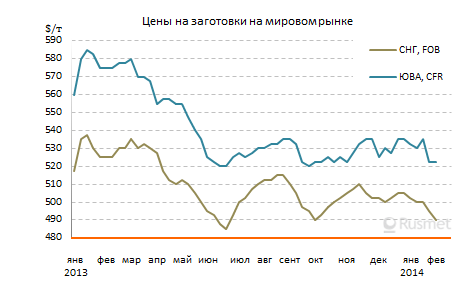 В Восточной Азии стоимость заготовок упала в конце января, когда перед новогодними праздниками по китайскому календарю некоторые компании из КНР устроили «дешевую распродажу», предлагая полуфабрикаты в страны Юго-Восточной Азии по $515-520 за т CFR. Российские экспортеры заключали контракты на уровне около $525-530 за т CFR, остальные игроки фактически находились вне рынка.