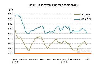 В Восточной Азии во второй половине апреля несколько подешевели китайские заготовки, отреагировавшие таким образом на снижение стоимости железной руды. Крупные компании по-прежнему предлагают свою продукцию в страны Юго-Восточной Азии примерно по $525 за т CFR, но мелкие производители готовы продавать полуфабрикаты по $515 за т CFR и менее. Из-за этого российские заготовки стоимостью $525-535 за т CFR практически не пользуются спросом.