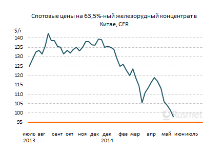 /Rusmet.ru, Виктор Тарнавский/ С начала текущего года спотовые цены на железную руду упали уже более чем на 25%. В последние дни котировки на 62%-ный материал впервые с сентября 2012 года опустились ниже отметки $100 за т CFR Китай. Причем, по мнению многих аналитиков, спад на этом еще не завершился, и цены могут найти «дно» лишь на уровне $90 за т CFR.