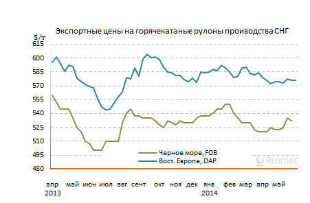 При заключении сделок с покупателями в Турции и странах Ближнего Востока российские компании добились подорожания горячекатаных рулонов до $540-550 за т FOB по сравнению с $530-545 за т в предыдущем месяце. Магнитогорский меткомбинат распродал часть продукции, предназначенной для Ирана, по $550-555 за т FOB, но во второй половине мая поднял котировки до $560 за т FOB и более. Холоднокатаные рулоны российского производства закрепились в интервале $600-610 за т FOB.