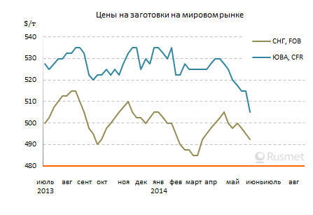 В то же время, в странах Восточной Азии китайские заготовки оказали мощное понижающее воздействие на рынок. К концу мая их стоимость рухнула до $490-510 за т CFR, что заведомо дешевле, чем у любых других поставщиков. В частности, российские полуфабрикаты в середине мая продавались в Юго-Восточную Азию по $525-530 за т CFR.