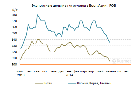 Коммерческая стальная продукция из стран Северо-Восточной Азии присутствует на региональном рынке в сравнительно небольших объемах и по низким ценам. По данным трейдеров, экспортеры выставляют цены на горячий прокат на уровне $540-560 за т FOB, но реальные сделки осуществляются в интервале $520-550 за т FOB. Прогноз на июль негативный.