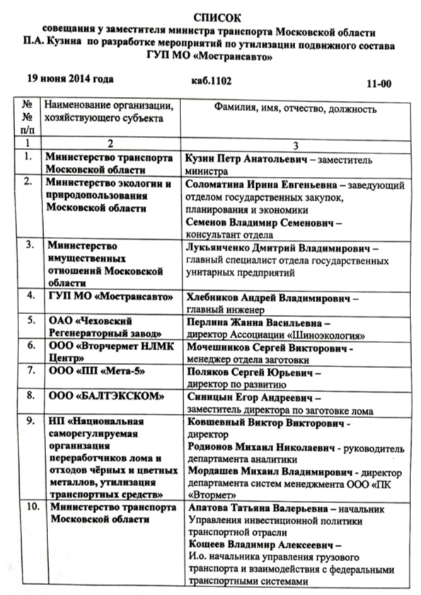 /Михаил Родионов, Rusmet.ru/ Вчера, 19 июня 2014 г., в Министерстве транспорта Московской области состоялось первое рабочее совещание а рамках создания региональной системы утилизации вышедших из эксплуатации транспортных средств (ВЭТС) под председательством заместителя министра П.А. Кузина.