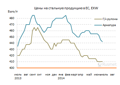 /Rusmet.ru, Виктор Тарнавский/ Спад на европейском рынке стали, продолжающийся фактически с января текущего года, никак не удается остановить. С начала июня стоимость длинномерного проката в регионе уменьшилась на 10-15 евро за т. В частности, арматура в настоящее время, в основном, варьируется между 425 и 460 евро за т EXW. Котировки на плоский прокат в текущем месяце примерно на 5 евро за т уступают майским показателям, а некоторые компании, ранее предлагавшие свою продукцию по ценам выше рыночных, опускают их до уровня конкурентов.
