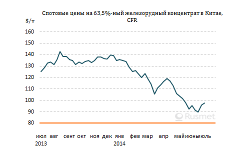 /Rusmet.ru, Виктор Тарнавский/ Котировки на 62%-ный австралийский материал, 16 июня впервые с сентября 2012 года опустившиеся ниже отметки $90 за т CFR Китай, за прошедшие с тех пор три недели несколько увеличили свое значение. В конце июня – начале июля стоимость этой продукции, в основном, находилась в интервале $94-97 за т. В связи с этим многие участники рынка настроены довольно оптимистично.