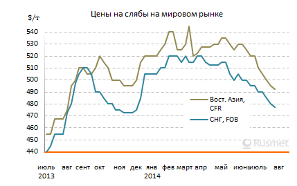 /Rusmet.ru, Виктор Тарнавский/ На рынке слябов уже второй месяц подряд продолжается медленное понижение цен. Стоимость полуфабрикатов в течение июля опустилась на $5-10 за т в Турции и более чем на $20 за т в странах Восточной Азии. При этом, спад происходит на фоне достаточно высокого объема продаж.