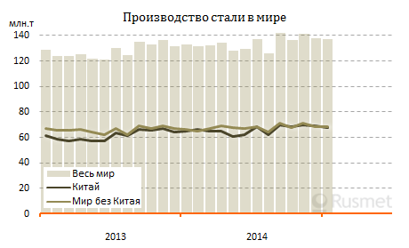 /Rusmet.ru, Виктор Тарнавский/ Как сообщает World Steel Association (WSA), в июле 2014 года глобальный объем выплавки стали (без учета АСЕАН и ряда стран Африки и Азии) составил 136,8 млн. т, что на 3,0% превышает показатели аналогичного периода прошлого года. Тем не менее, по сравнению с июнем среднедневная выплавка стали в мире уменьшилась на 3,9% и составила 4,41 млн. т, что представляет собой минимальный показатель за этот год. Уровень загрузки производственных мощностей, по данным WSA, в июле сократился на 2,9 п.п. по сравнению с предыдущим месяцем, до 75,4%. Это также является минимальным показателем для 2014 года.