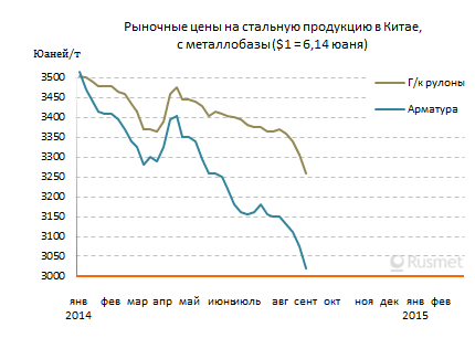 /Rusmet.ru, Виктор Тарнавский/ Котировки на прокат на китайском внутреннем рынке медленно снижались с апреля по середину августа. Однако во второй половине прошлого месяца этот спад заметно ускорился. Если ранее средний уровень цен на горячекатаные рулоны сокращался на 20-40 юаней за т в месяц, то в августе понижение составило около 100 юаней (более $16) за т. Стоимость арматуры на металлобазах в крупнейших городах страны опустилась за последние три-четыре недели почти на $20 за т и упала ниже отметки $500 за т – впервые с 2009 года. Котировки на арматуру на Шанхайской фьючерсной бирже чуть ли не каждый день устанавливают новые абсолютные минимумы и уже сократились до менее $465 за т.